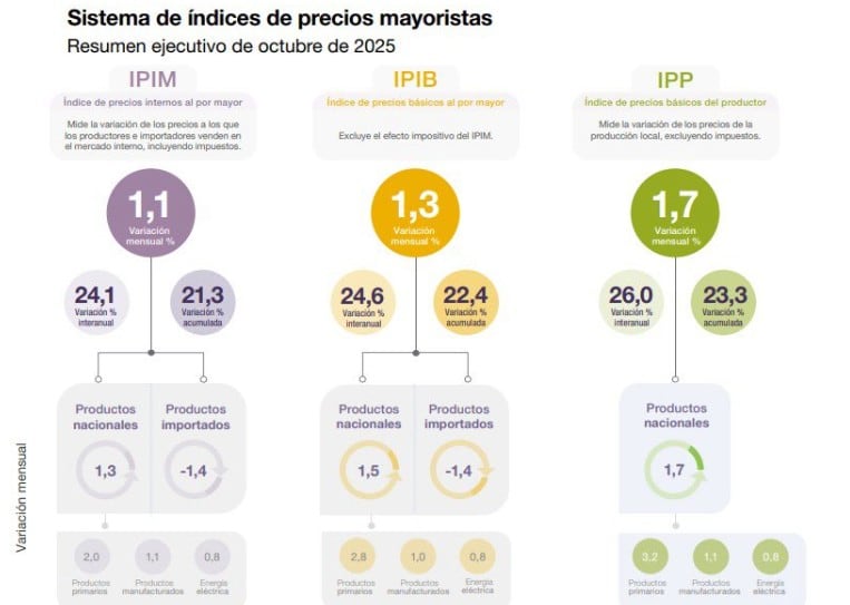 Los precios mayoristas aumentaron 1,1% en octubre de 2025 respecto del mes previo y acumularon un alza de 21,3% en diez meses, informó este martes el INDEC.