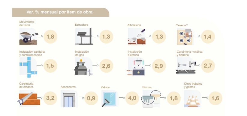 Este resultado es consecuencia de las alzas de 2,1% en el capítulo “Materiales”, 1,3% en “Mano de obra” y 1,6% en “Gastos generales”.