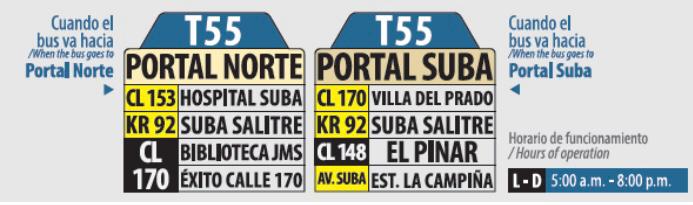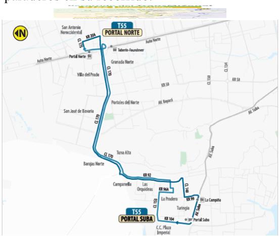 La ruta T55 inicia su servicio en la avenida Ciudad de Cali con calle 150C, junto al Portal Suba, y atraviesa zonas clave como la avenida Ciudad de Cali, calle 153, carrera 92 y calle 170, hasta llegar a la Autopista Norte con calle 172A, costado oriental, frente al Portal Norte. Este trayecto, que ahora cuenta con un refuerzo en su oferta operacional, incluye 22 paraderos en el sentido hacia el Portal Norte y 19 paraderos en su retorno hacia el Portal Suba, brindando mayor cobertura y accesibilidad a los sectores con mayor concentración de usuarios.