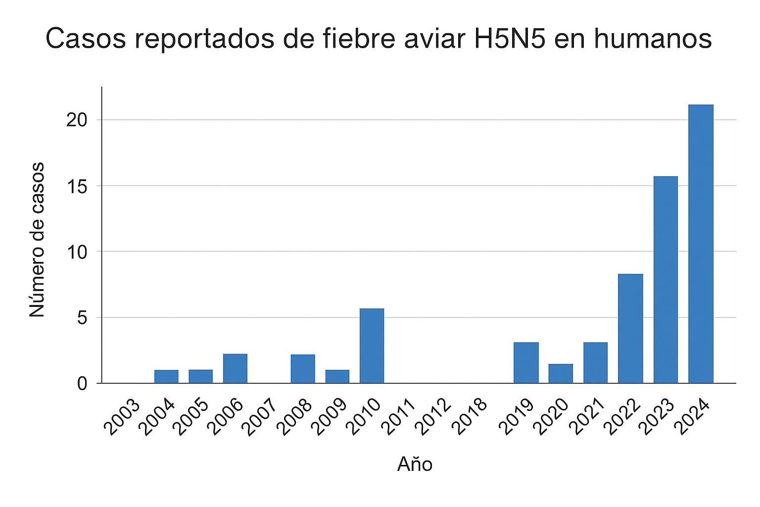 Contexto de H5 en 2024–2025: Hubo docenas de infecciones humanas confirmadas por subtipos H5 mayormente H5N1 en varios países, total, que varían según los datos tomados, los conteos periódicos son hechos por CDC/WHO. Para poner un ejemplo, la OMS históricamente reportó cerca de 990 casos humanos de H5N1 entre 2003–2025, muy letales, pero esos datos solo son de H5N1, no son directamente extrapolables a H5N5.