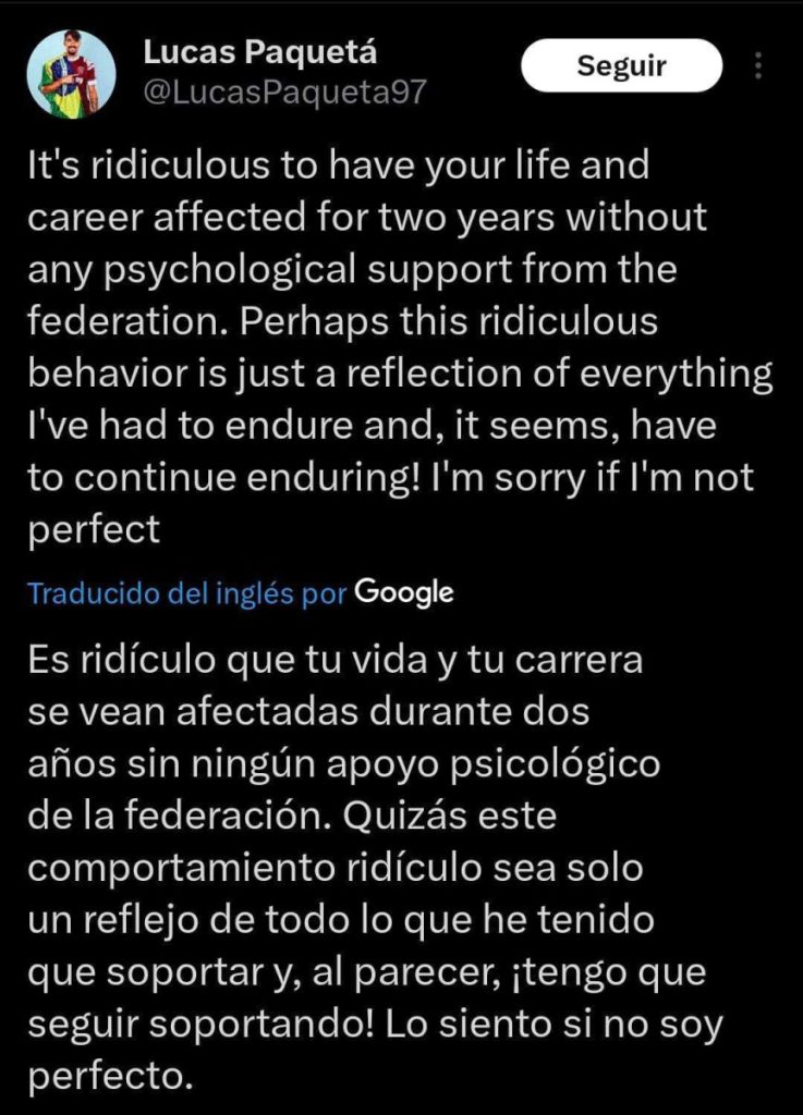 Los medios británicos no tardaron en calificar el comportamiento de Paquetá como “ridículo”. Ante estos señalamientos, el volante no dudó en responder, defendiendo su postura: “Es ridículo que mi vida y mi carrera se vean afectadas durante dos años, sin recibir ningún tipo de apoyo psicológico por parte de la federación. Tal vez este comportamiento ridículo sea solo un reflejo de todo lo que he tenido que soportar, y parece que seguiré soportando. ¡Perdón si no soy perfecto!”, expresó Paquetá.