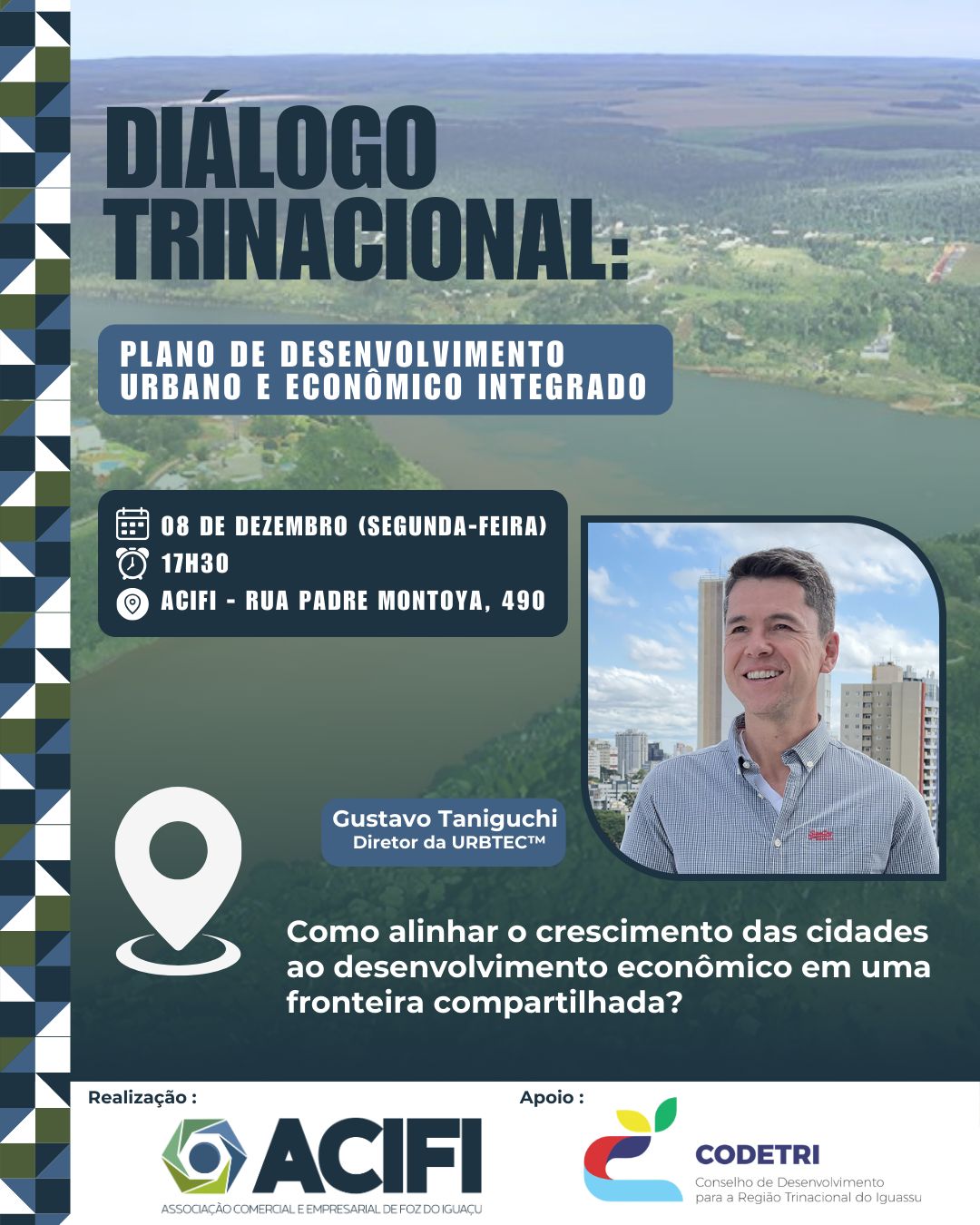 El consultor Gustavo Taniguchi será el invitado especial en una conferencia y diálogo sobre desarrollo trinacional que se llevará a cabo el 8 de diciembre, a las 17:30, en Foz do Iguaçu. El objetivo del encuentro es avanzar en experiencias, conceptos, métodos y prácticas que promuevan el crecimiento conjunto de las ciudades en un territorio compartido, como lo es la región de las Tres Fronteras entre Argentina, Brasil y Paraguay.