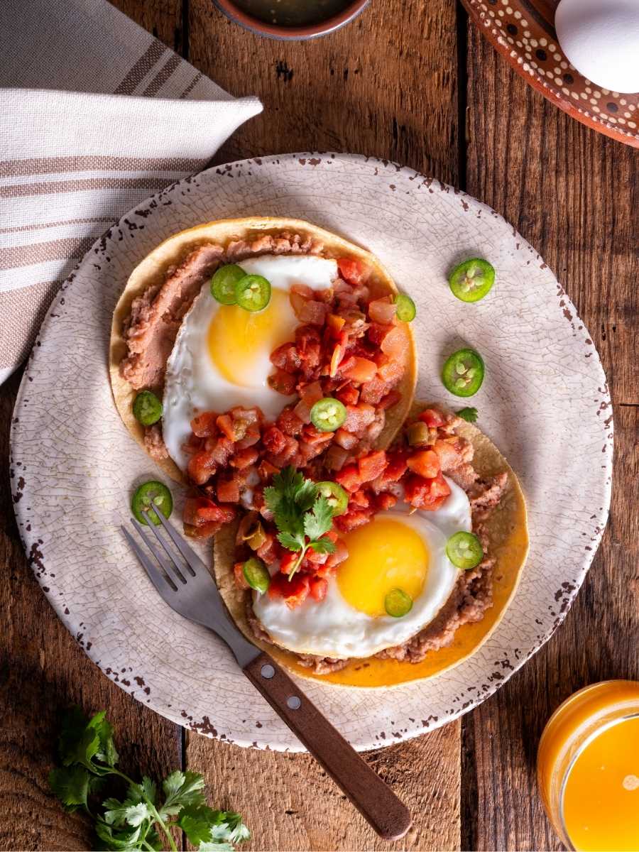 Para montar el plato, coloca una tortilla, unta un poco de los 150 g de frijoles refritos, pon encima un huevo frito y cúbrelo con un par de cucharadas de salsa caliente. Si te apetece, termina con unas hojas de cilantro fresco o jalapeño en rodajas para dar color.