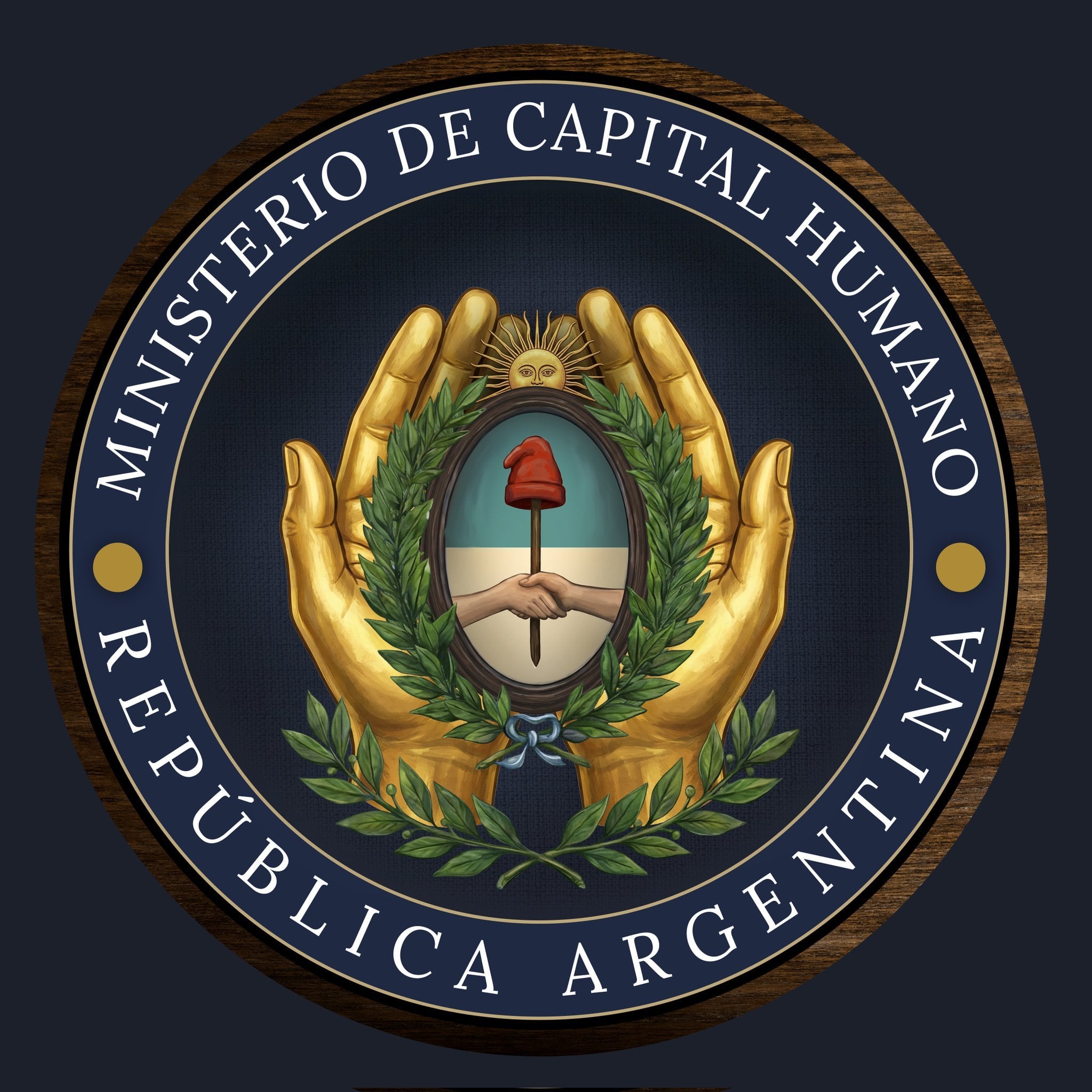En cuanto al Ministerio de Capital Humano, presenta unas grandes manos doradas sosteniendo el escudo, una elección gráfica atípica en la heráldica estatal argentina, que ha sido tildada de tener connotaciones religiosas o de “asistencialismo divino”.