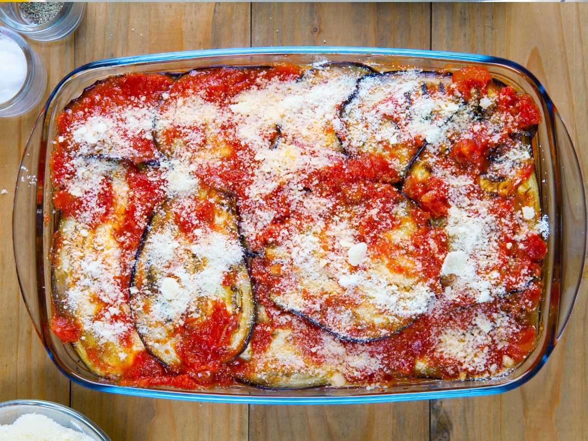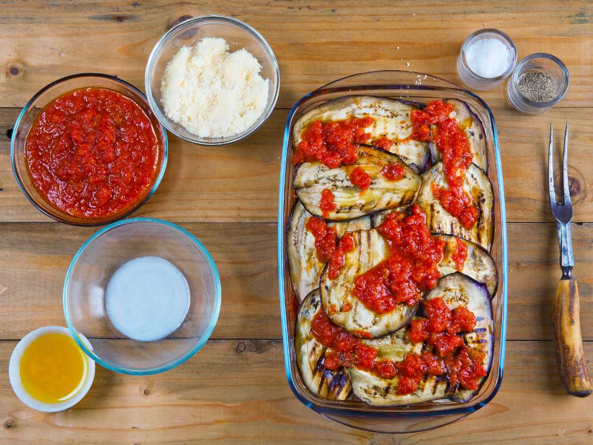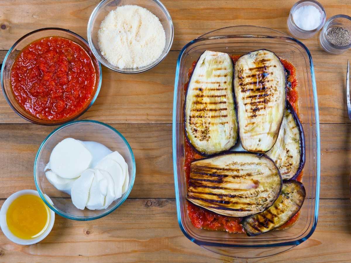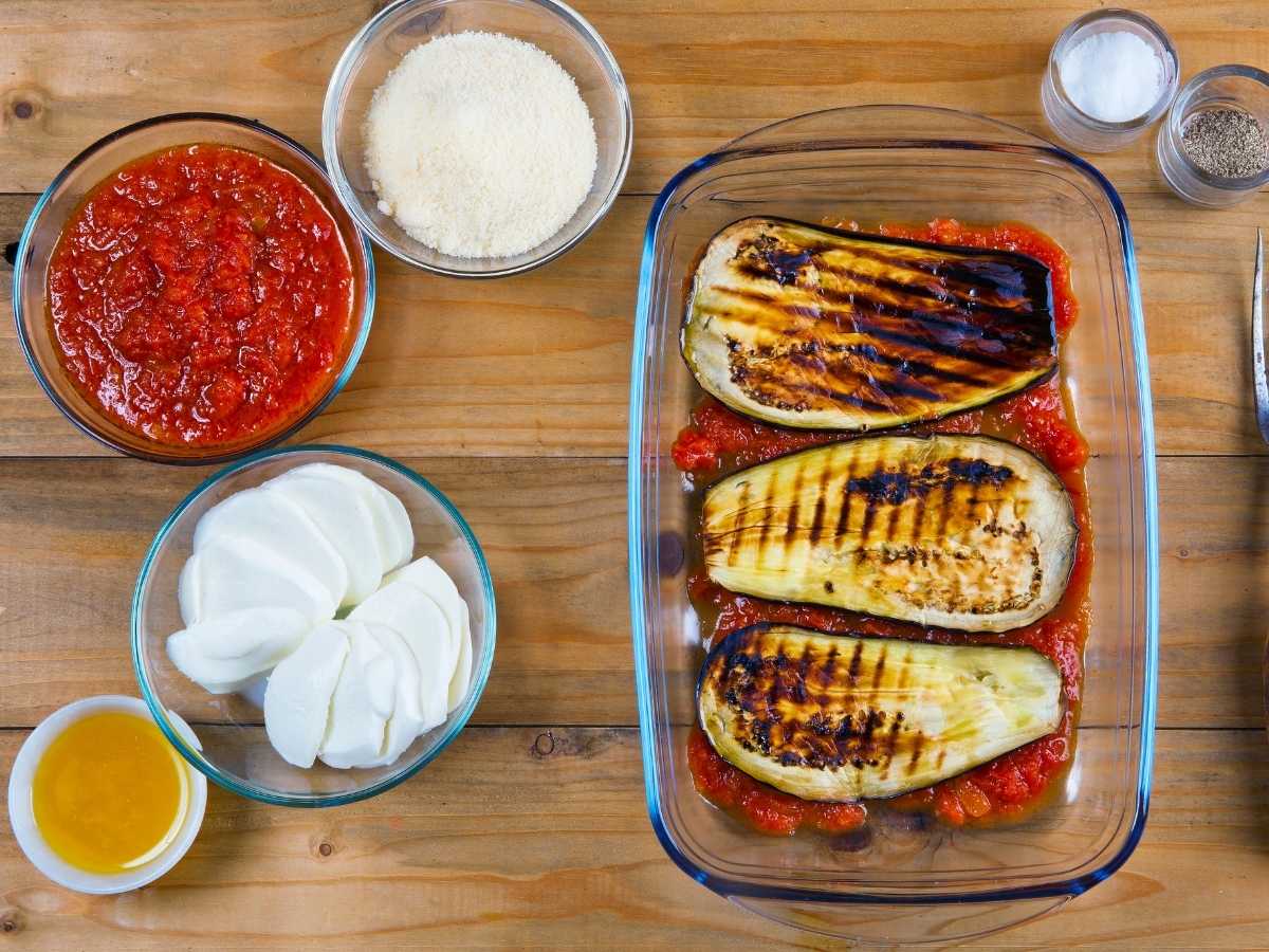 - A partir de ahí, el proceso es el mismo: alternar capas de berenjena frita, salsa de tomate, mozzarella y parmesano rallado, terminando con queso por encima y al horno a 180 °C durante unos 25 minutos.