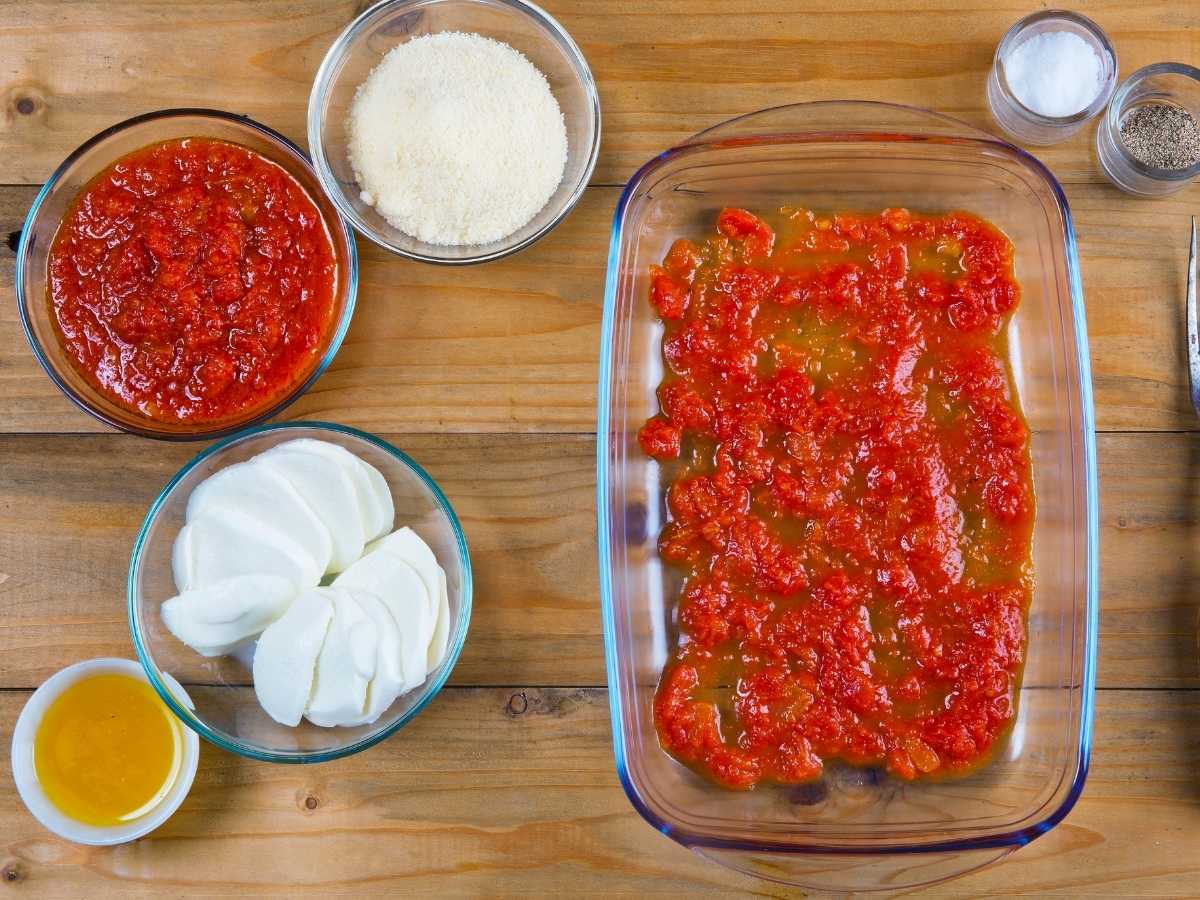 Una vez listas las berenjenas y la salsa, es momento de montar la parmigiana. En una fuente de horno, pon una capa de salsa de tomate. -