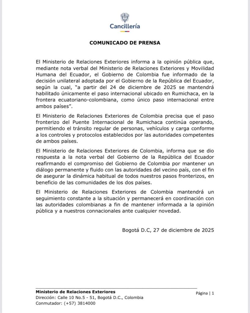 El Ministerio de Relaciones Exteriores informa a la opinión pública que el Gobierno de Colombia ha sido notificado, mediante nota verbal del Ministerio de Relaciones Exteriores y Movilidad Humana del Ecuador, de la decisión adoptada de manera unilateral por el Gobierno de la República del Ecuador de mantener habilitado, a partir del 24 de diciembre de 2025, únicamente el paso internacional de Rumichaca como punto oficial de tránsito en la frontera común entre ambos países. Ante esta comunicación, la Cancillería colombiana precisa que el Puente Internacional de Rumichaca continúa operando con normalidad, permitiendo el tránsito regular de personas, vehículos y carga, de conformidad con los controles, procedimientos y protocolos establecidos por las autoridades competentes de Colombia y del Ecuador, en el marco de la cooperación binacional y del respeto a las normas vigentes.