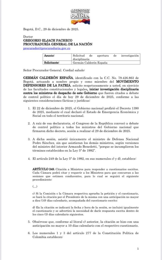 El jurista y constitucionalista Germán Calderón España radicó una solicitud formal de investigación disciplinaria contra los ministros del actual Gobierno que no asistieron a la citación realizada por el Senado de la República para un debate de control político. La acción fue presentada ante las autoridades competentes con el propósito de que se evalúe si la ausencia de los funcionarios constituye una falta frente a los deberes constitucionales y legales que rigen el ejercicio del cargo.