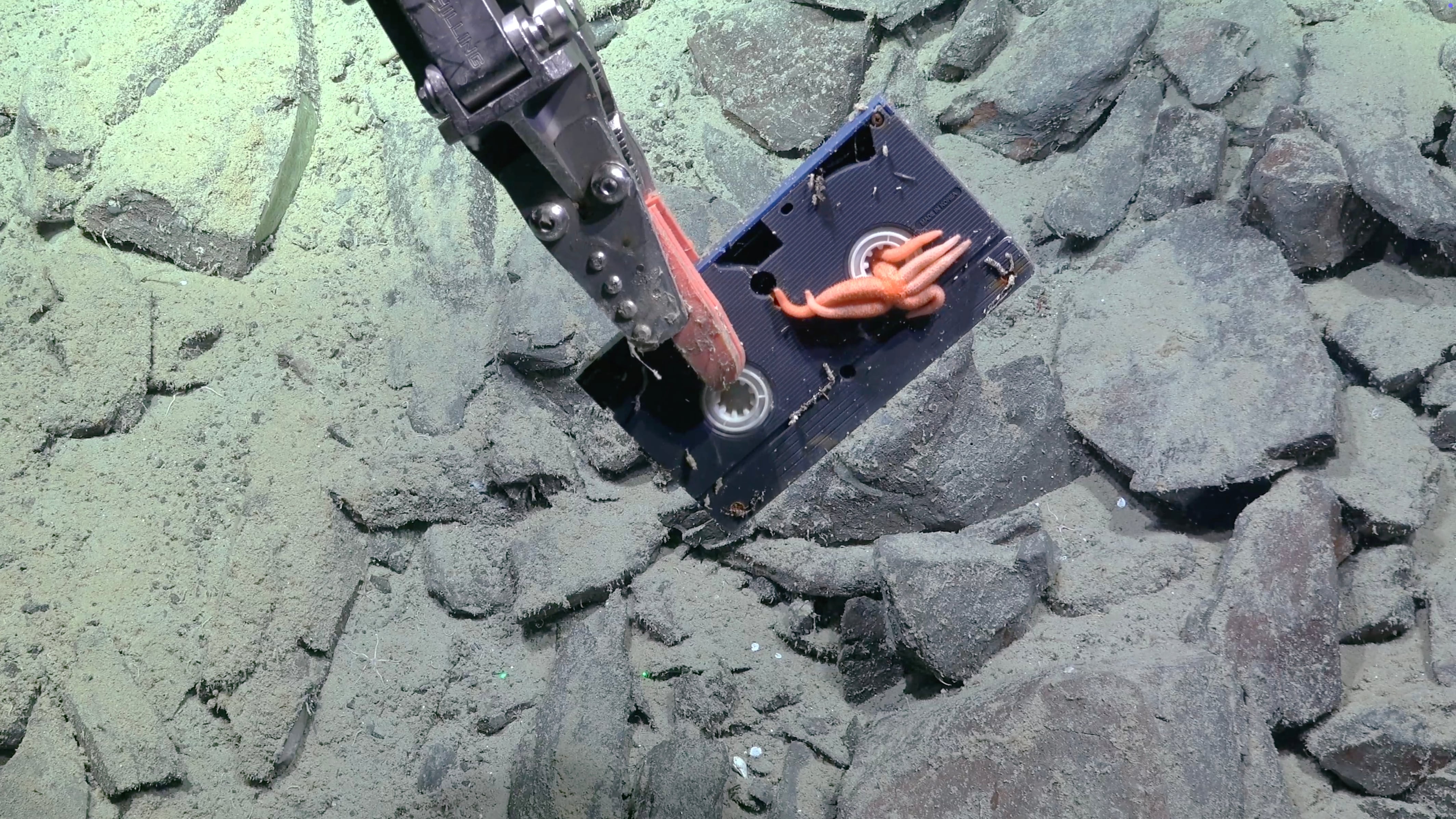 Un tape VHS es recogido desde el fondo del mar con el brazo robótico del rover SuBastian (SOI)