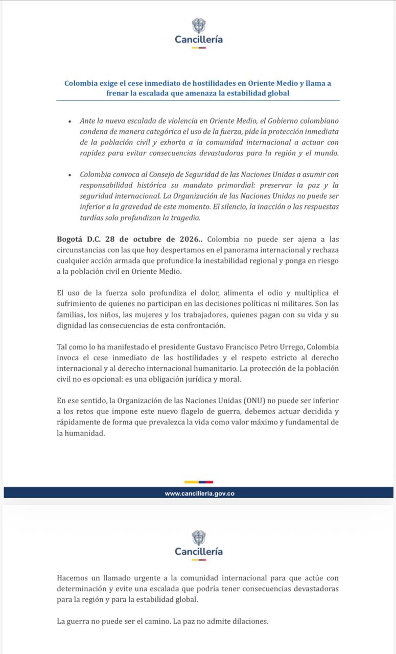 En medio de la creciente escalada de violencia en Oriente Medio, el Gobierno de Colombia elevó su voz en el escenario internacional para exigir el cese inmediato de las hostilidades y advertir sobre el riesgo de una desestabilización que podría trascender las fronteras de la región. La posición oficial quedó consignada en un comunicado de la Ministerio de Relaciones Exteriores de Colombia, que condena de manera categórica el uso de la fuerza y reclama la protección urgente de la población civil.