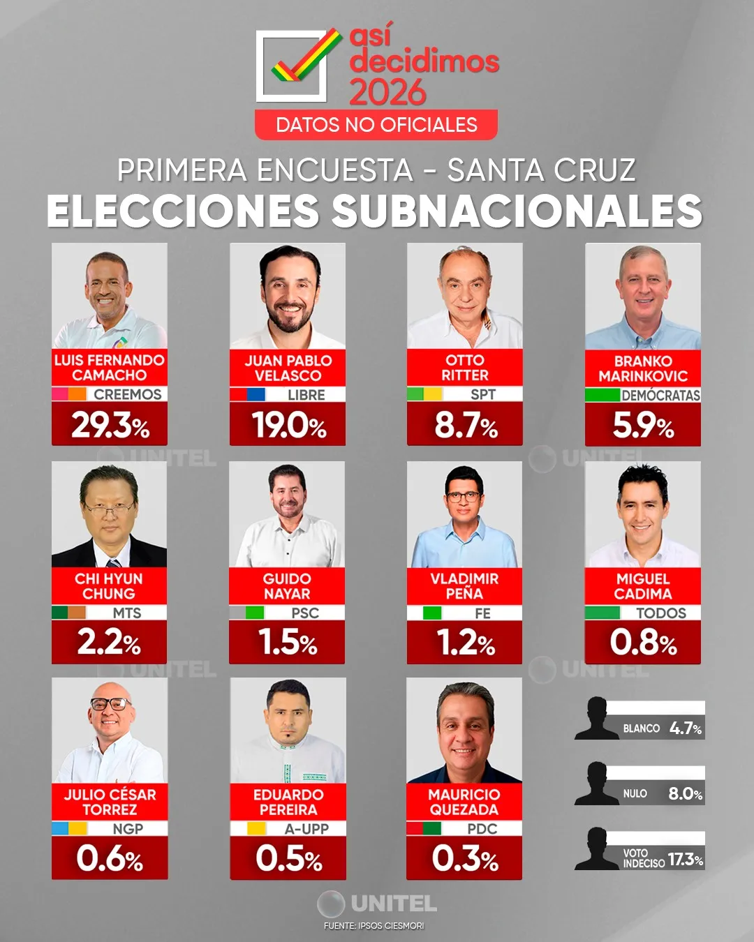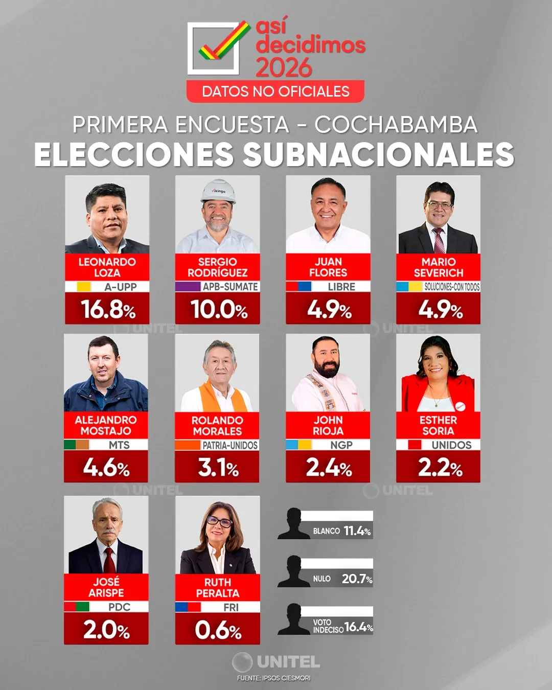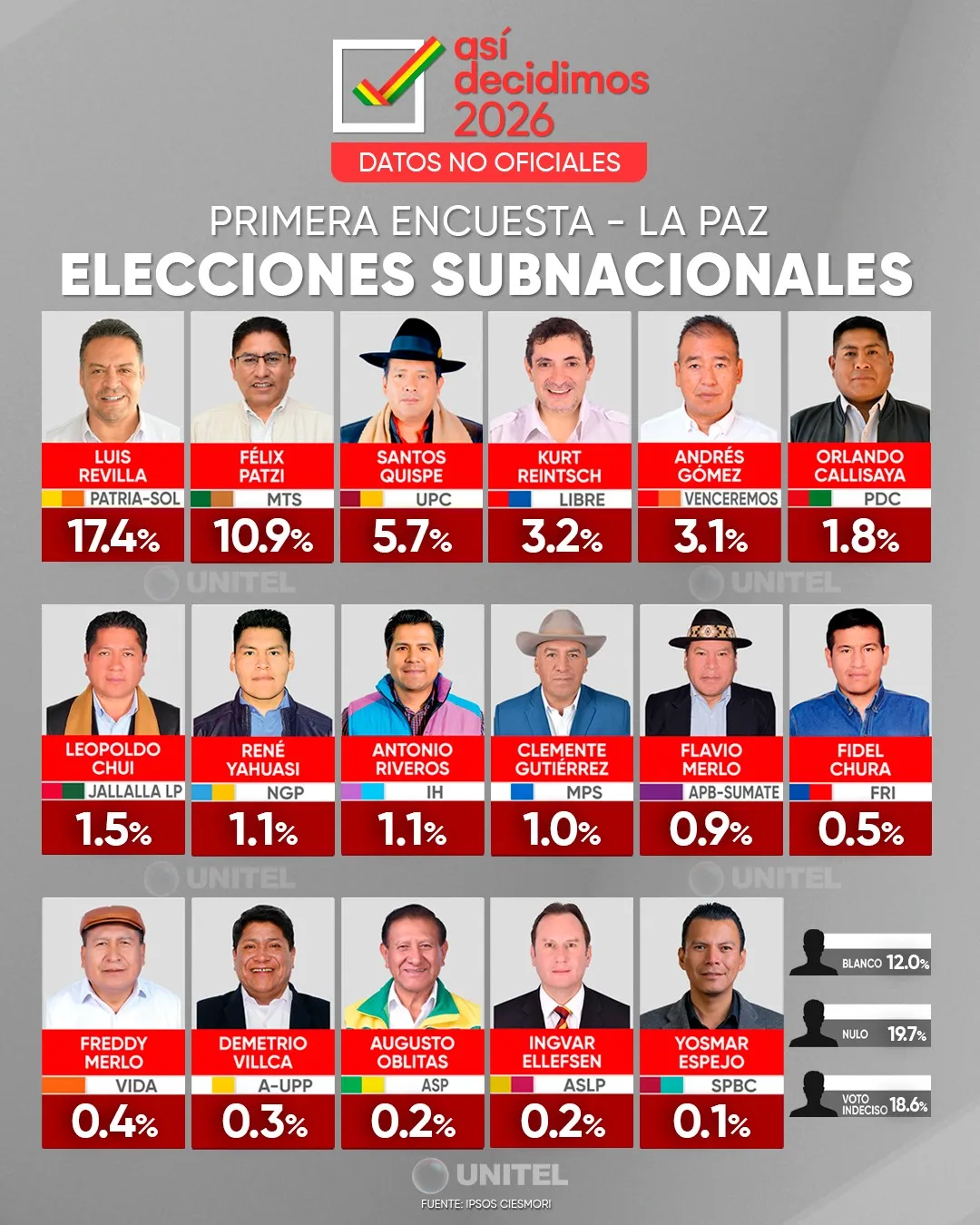 El 19 de febrero, Unitel difundió los resultados oficiales de las primeras encuestas de alcaldías (solo ciudades capitales) y gobernaciones del eje troncal: La Paz, Cochabamba y Santa Cruz, rumbo a las Elecciones Subnacionales 2026. El estudio fue elaborado por Ipsos – CIESMORI, empresa que está en la nómina oficial de entidades habilitadas por el Tribunal Supremo Electoral para elaborar y difundir estudios de opinión en materia electoral.