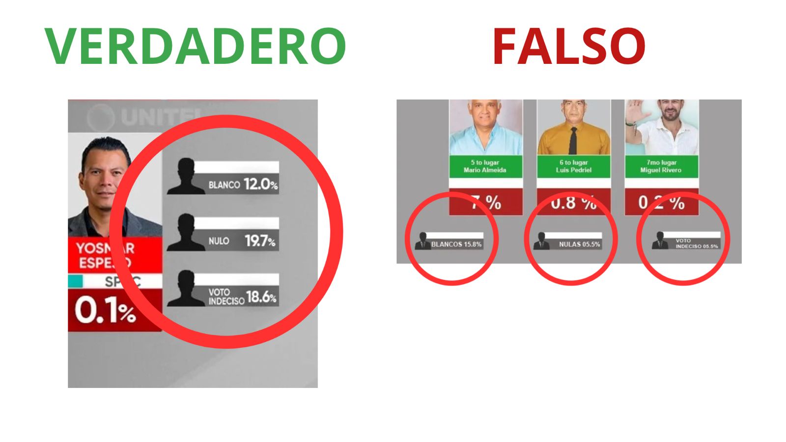 Además, en las encuestas auténticas, los porcentajes de voto nulo, blanco e indeciso para gobernador se presentan en el sector inferior derecho. En cambio, en la encuesta falsa aparecen ubicados en otra posición, lo que evidencia que no sigue el formato original.