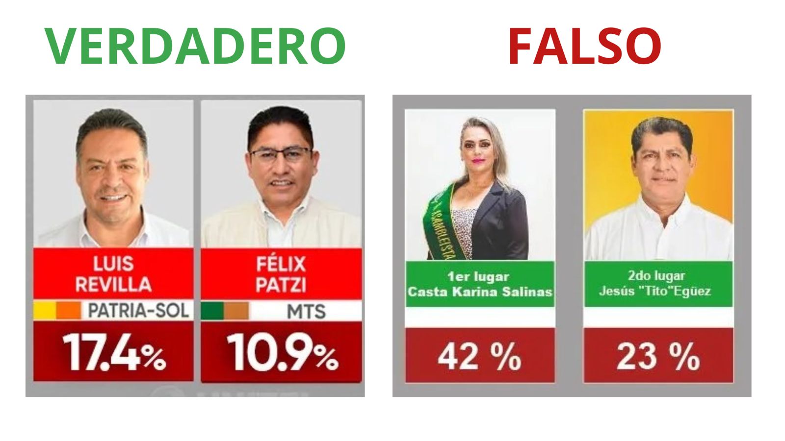 Por otro lado, los resultados oficiales presentan los porcentajes en color rojo, mientras que la publicación falsa los muestra en verde, alterando el diseño original: