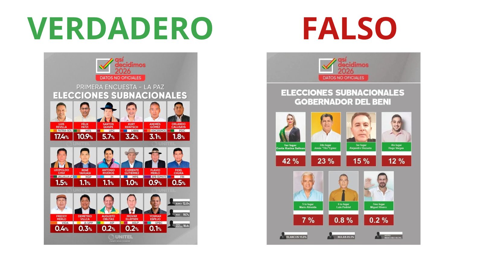 Por tanto, la imagen es falsa. Utilizan de manera indebida el logo del programa ‘Así Decidimos 2026’ y atribuyen a Unitel una encuesta que no figura en ninguna publicación oficial.