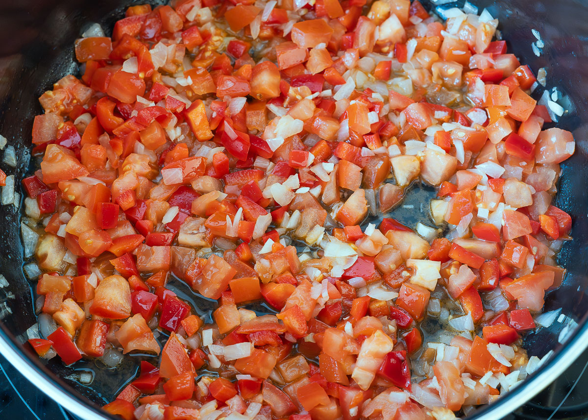 Pica la cebolla y los dientes de ajo en dados finos. Corta el pimiento rojo en trozos pequeños y trocea los tomates de forma gruesa. Calienta aceite o mantequilla en una sartén grande y sofríe la cebolla y el ajo hasta que estén transparentes; después, añade el pimiento y los tomates troceados y saltéalos brevemente.