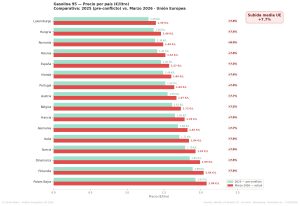 España está en una posición intermedia con 1684 euros litro, ligeramente por debajo del promedio europeo, aunque’ con una preocupante tendencia al alza. El aumento ha sido especialmente severo en España: entre el 2 y el 9 de marzo de 2026, la gasolina aumentó 21 céntimos por litro (111%), el segundo mayor incremento de la UE tras la República Checa.
