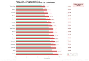 Los precios de la gasolina Super 95 en la Unión Europea exhiben una dispersión notable, evidenciando las disimilitudes fiscales entre los Estados miembros y, también, la disparidad en las estructuras del mercado. Conforme a la data del Boletín Petrolero de la Comisión Europea, actualizada a marzo de 2026, el precio medio de la gasolina en la UE se estaciona en 1692 euros por litro, mostrando una variación del 65% entre el país más oneroso y el más económico.