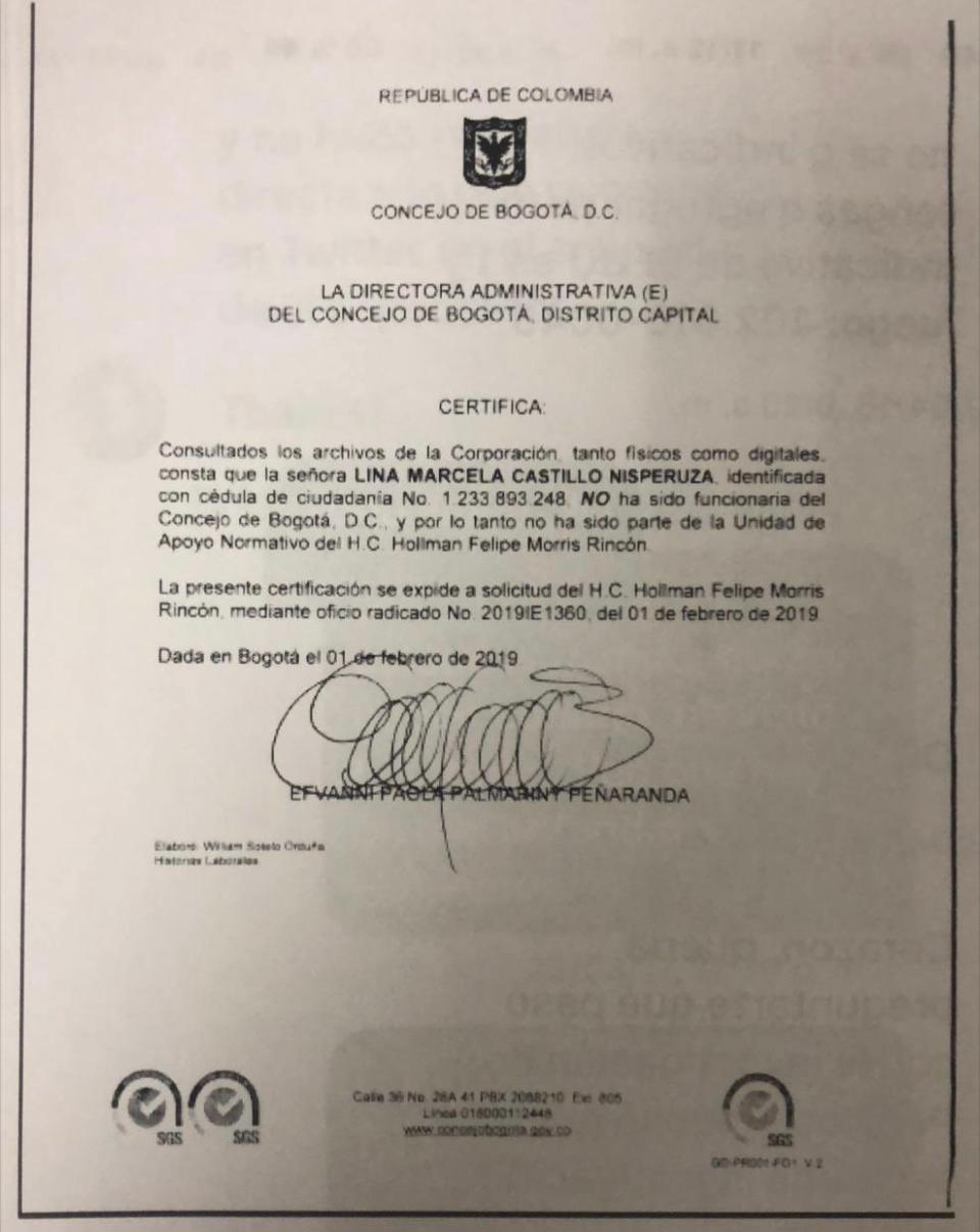 Lina Castillo, nunca trabajó en el concejo de Bogotá