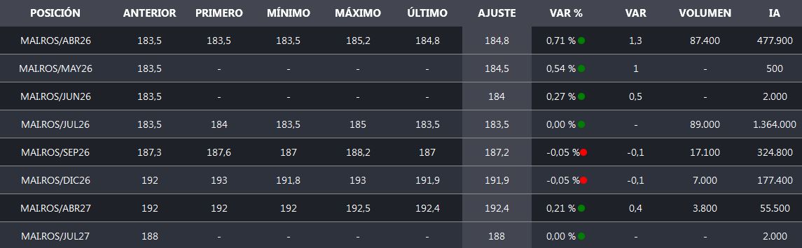 Este martes el contrato Maíz Rosario Abril 2026 finalizó en 184,8 u$s/tonelada con un volumen negociado de 87.400 toneladas. Se trata de un valor que está equiparado con la capacidad teórica de pago de la exportación, lo que no es usual en función la época del año. la posición Maíz Julio 2026 (cosecha del maíz tardío) también estuvo muy activa con un volumen operado de 89.000 toneladas.