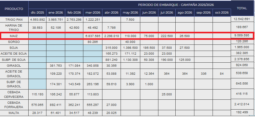 Los embarques registrados (DJVE) de maíz 2025/26 a la fecha suman 9,56 millones de toneladas, de los cuales la mayor parte está concentrado en los meses de marzo y abril de este año.